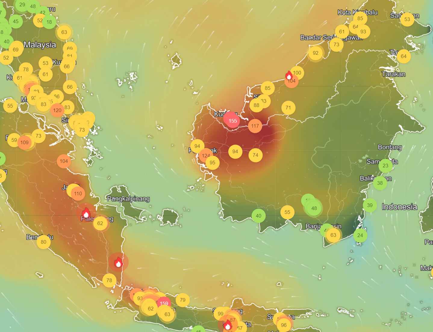 헤이즈는 남부 칼리만탄에서 발생한 뒤 북쪽으로 불어오는 바람을 타고 사바(Sabah) 지역까지 도달합니다. 특히 9월부터 10월에는 비가 거의 오지 않고 대기 정체가 심해, 미세먼지(PM2.5) 수치가 100에서 200 이상으로 치솟기도 하며 연무가 며칠씩 머무는 경우도 많습니다.