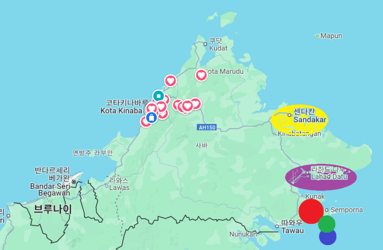 동부 연안 지역은 여전히 위험한 지역으로, 납치와 테러 위험이 높은 곳으로 주목받고 있습니다. 이 지역은 필리핀 반군들이 쉽게 접근할 수 있는 지리적 위치에 있어 외국인 여행자들에게 매우 위험할 수 있습니다. 필리핀 반군들은 고속정을 이용해 1시간 만에 이 지역에 도달할 수 있습니다. 또한, 2014년부터 2016년까지 세말루 납치 사건, 라하다투 납치 사건, 푸라우 잠부낭 납치 사건 등이 발생했습니다. 지도에서 노란색, 보라색, 빨간색, 녹색, 파란색 지역은 납치사건과 전쟁이 있었던 지역입니다.